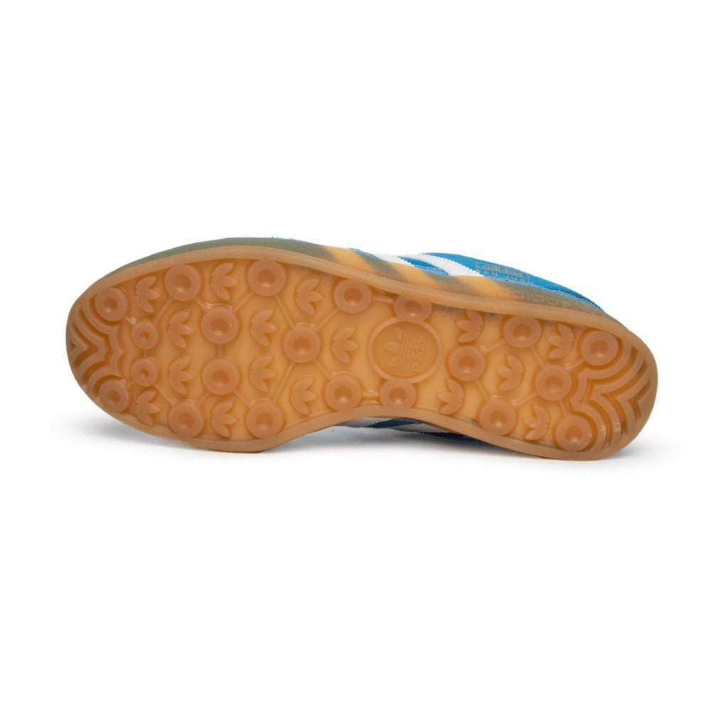 IO Bad Bunny x adidas Gazelle Indoor “San Juan” traz inspiração nos céus radiantes e nas praias da cidade natal do artista. O cabedal em couro ganha destaque com um tom intenso de azul, acompanhado por uma biqueira perfurada e uma sobreposição de camurça texturizada no antepé. As três listras clássicas em couro branco aparecem nas laterais, enquanto detalhes exclusivos surgem no painel de camurça do calcanhar com a etiqueta de tamanho e a inscrição “adidas San Juan” em dourado. Finalizando o design, o modelo conta com uma sola de borracha semitranslúcida que garante um estilo único.